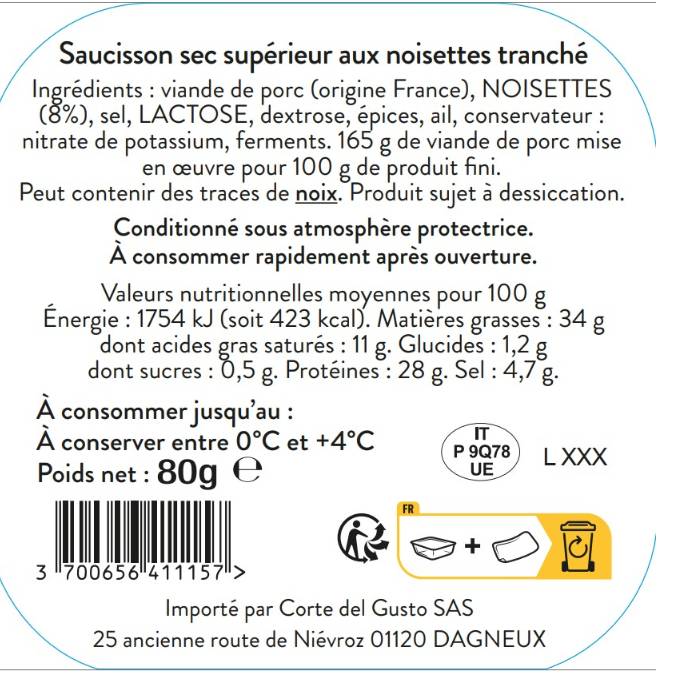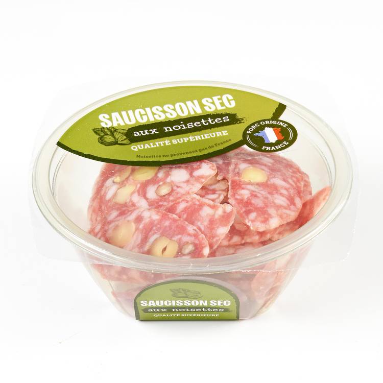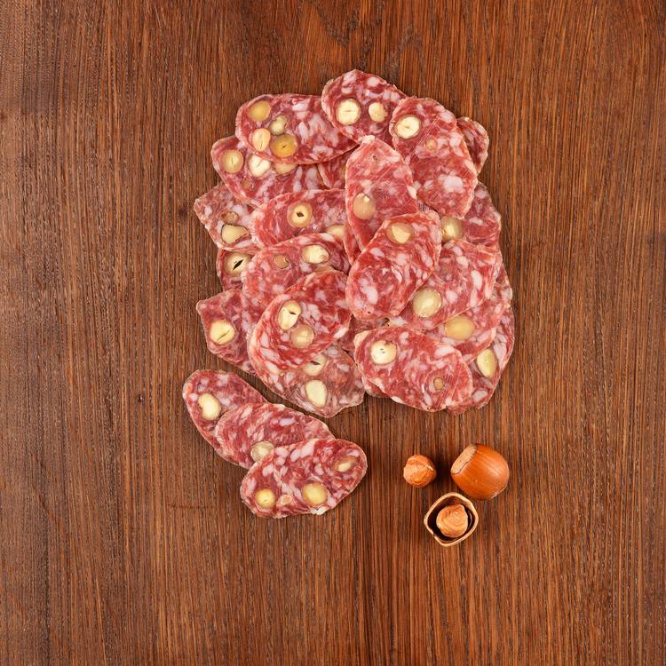 Origine & savoir-faire : Saucisson sec supérieur élaboré à partir de viande de porc sélectionnée, embossé puis affiné lentement. Le séchage développe les arômes, tandis que les noisettes sont intégrées pour enrichir la texture et signer une version plus gourmande du grand classique.