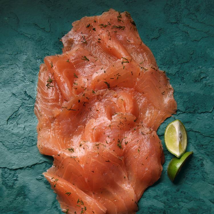 Spécialité culinaire scandinave, ce saumon gravlax est préparé à partir de filets de saumon cru jamais congelés délicatement marinés à l'aneth. Le poissons repose quelques jours dans la marinade pour "cuire" dans son sel. Le saumon gravlax est une spécialité scandinave de saumon cru mariné. Pour préparer du saumon gravlax, le filet de saumon est généralement enduit d'un mélange de sel, de sucre, et d'aromates tels que l'aneth. Le saumon est ensuite laissé à mariner pendant plusieurs jours, parfois sous poids, pour presser et aromatiser davantage la chair. Après cette période de marinade, le saumon est tranché finement avant d'être servi.Le processus de gravlax confère au saumon une texture délicate et une saveur subtilement salée et sucrée
