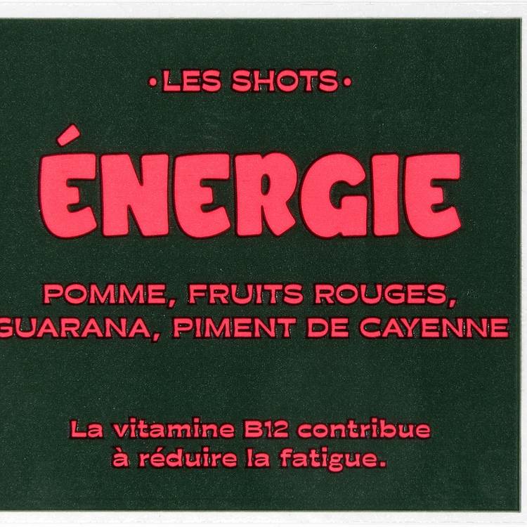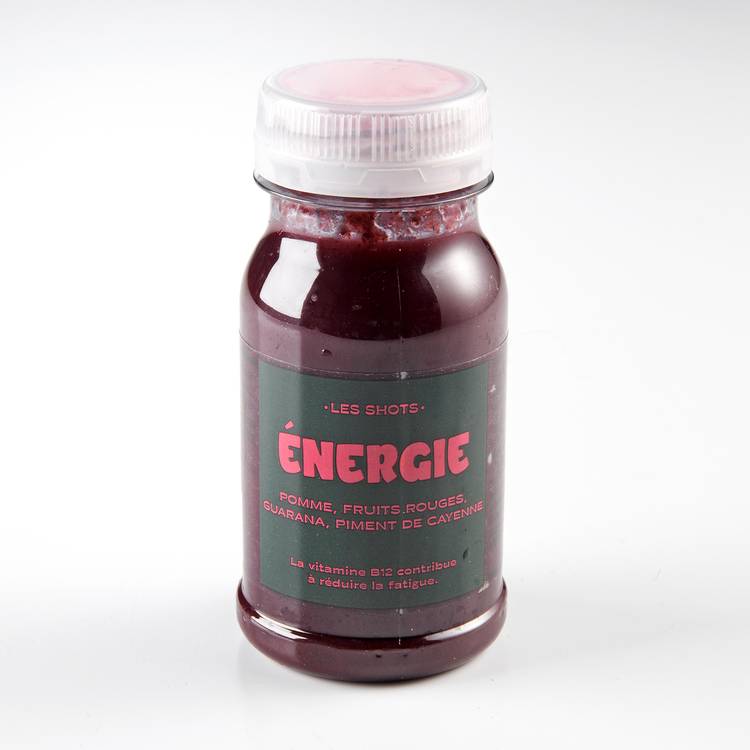 Petit format, gros effet. Ce shot “Force” ne paye pas de mine, mais il envoie. À la base, un jus de pomme doux et fruité. Dessus, une purée de myrtille bien marquée, presque boisée. Et derrière, ça monte : piment de Cayenne, extrait de guarana, vitamine B12. De quoi secouer l’organisme et remettre les idées en place en une gorgée.
