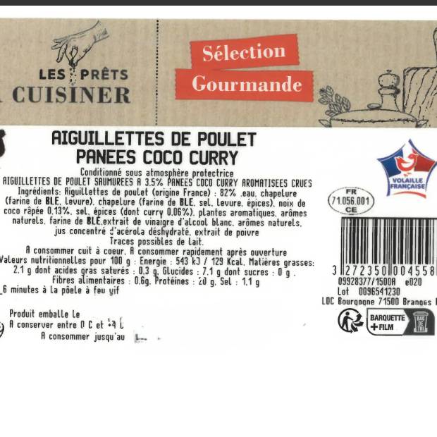 Saveur : Les aiguillettes de poulet offrent une chair tendre et moelleuse, enrobée d’une panure croustillante à la noix de coco. Le curry apporte une touche épicée douce et parfumée, relevée juste ce qu’il faut pour réveiller les papilles sans prendre le dessus.