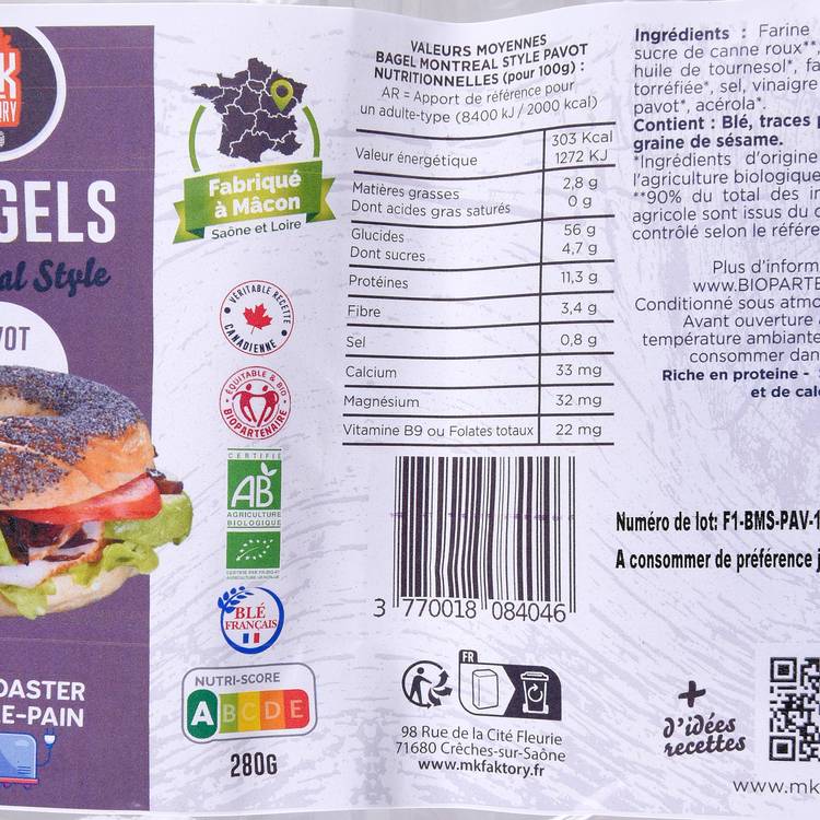 MK FACTORY a travaillé ce bagel façon “boiled” bain d’eau sucrée puis cuisson, comme dans les meilleurs bagel shops. À garnir selon vos envies — saumon, cream cheese, légumes, œufs ou simplement grillé pour accueillir beurre ou confiture. Ce bagel pavot joue la carte du sérieux : artisanal, bio, engagé — une base solide pour un petit déjeuner ou un sandwich fait maison.