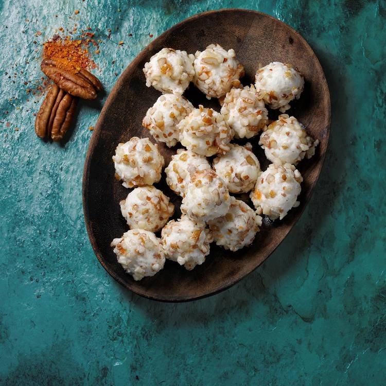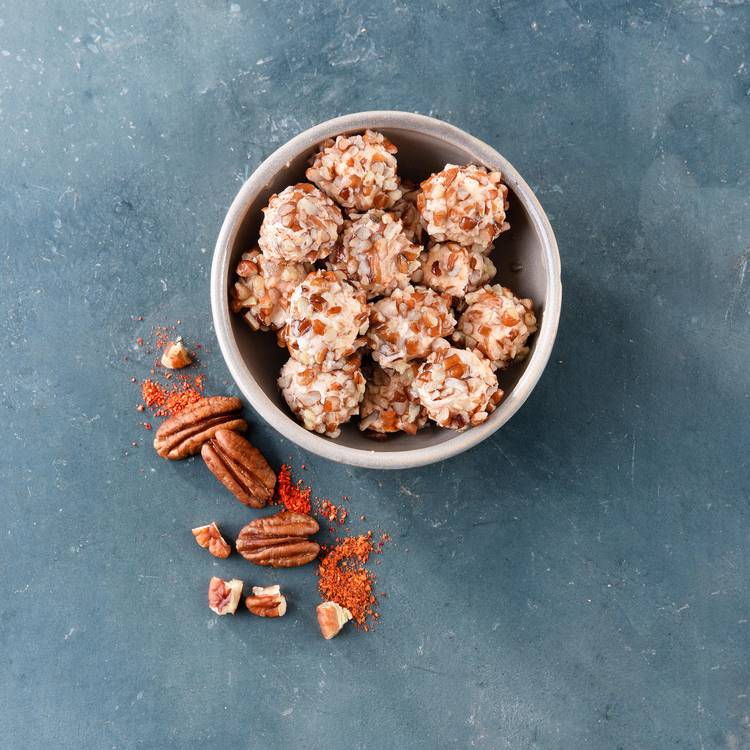 Autour, un manteau croquant de noix de pécan. Toastées juste ce qu’il faut pour amener la rondeur. Résultat : une bouchée qui claque sous la dent, entre chaleur, fraîcheur et croustillant. À piquer sans raison, ou à glisser sur une planche bien montée.