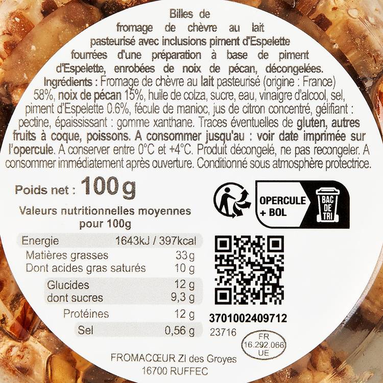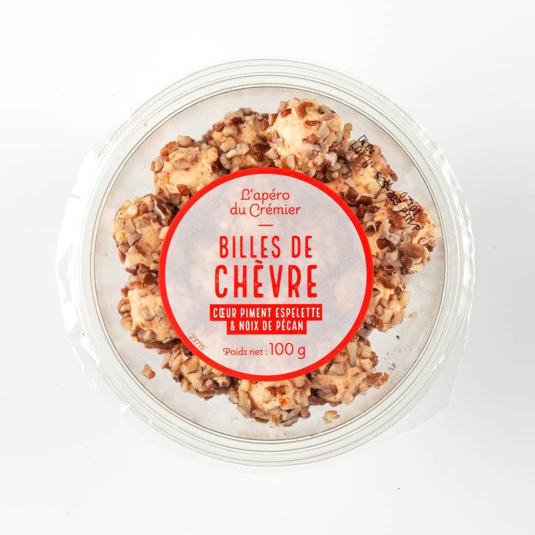 Petites, rondes, et sacrément bien roulées. Ces billes de chèvre allient le crémeux du fromage à la vivacité du piment d’Espelette. Un équilibre bien dosé, qui chatouille sans jamais brûler. Le cœur est doux, la surface a du répondant, et le tout se fond avec naturel dans un apéro qui ne veut pas être sage.