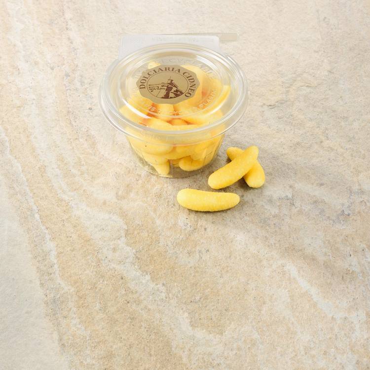 Un bonbon gélifié à la banane qui joue la carte de l’exubérance. Côté goût, on est sur une banane bien mûre, presque confite, qui tapisse le palais de son parfum fruité et sucré. Côté texture, c’est moelleux sans coller, fondant sans se dérober, avec juste ce qu’il faut de tenue pour garder du mordant. Il ne cherche pas à faire discret : il veut qu’on le remarque, et c’est réussi.