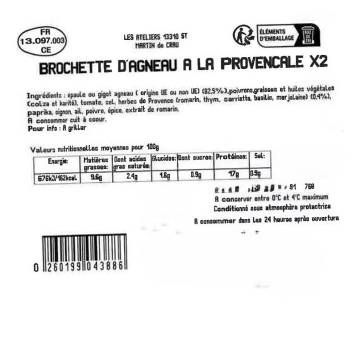Race de viande : Agneau sélectionné pour sa tendreté et son grain fin. Découpé en cubes réguliers, il est mariné avec des herbes de Provence, huile d’olive et ail pour en révéler toutes les nuances, sans masquer sa personnalité.
