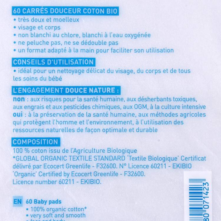 Ultra doux, ultra simples, ultra clean. Ces carrés de coton bio signés Douce Nature sont pensés pour les peaux les plus délicates : celles des bébés. Fabriqués en coton 100 % issu de l’agriculture biologique, ils ne sont ni blanchis au chlore, ni traités avec des substances douteuses. Ils ne peluchent pas, ne se dédoublent pas, et leur texture moelleuse fait toute la différence au quotidien.