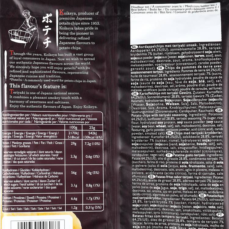 Origine : Inspirées de la célèbre sauce japonaise teriyaki, mélange de soja et de sucre, connue pour son goût brillant et gourmand. Ici, l’assaisonnement enrobe la chips sans la saturer.