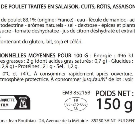 Origine & savoir-faire : Préparés à partir de filet de poulet origine France, ces émincés sont traités en salaison puis cuits et rôtis pour développer les arômes et conserver le moelleux de la viande. La découpe en fines lamelles les rend particulièrement pratiques et réguliers, prêts à être dégustés.