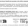 Saveur : Chair tendre de poulet rôti, relevée par une note herbacée de thym et une pointe de citron qui apporte de la fraîcheur. L’assaisonnement reste délicat, avec une salinité légère et une finale vive et parfumée.