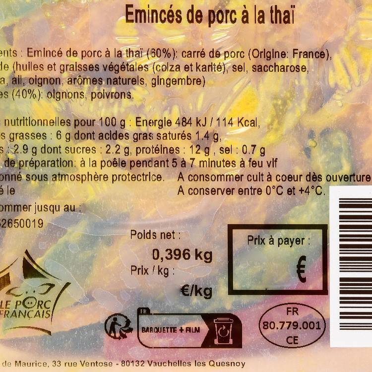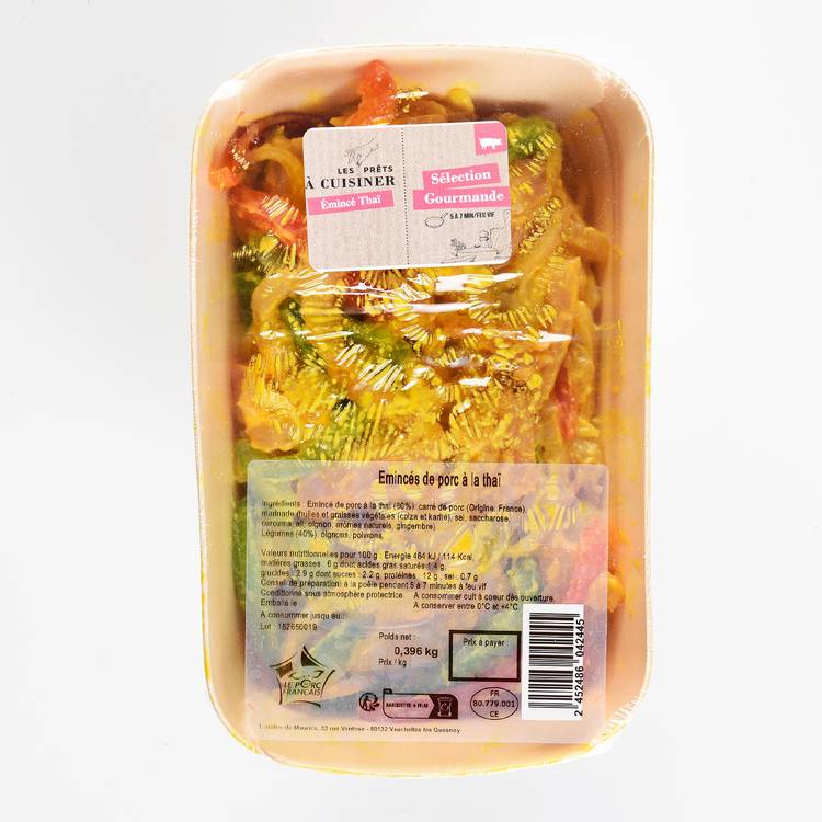 Race de viande : Porc européen sélectionné pour sa tendreté. Finement émincé pour une cuisson express, parfait pour les recettes sautées pleines de peps.