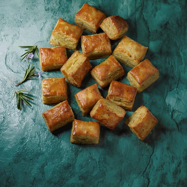 Dégustez l'alliance parfaite du croustillant et du parfum avec nos Feuilletés à l'Emmental et au Romarin. Chaque bouchée offre la richesse de l'Emmental associée à la subtilité aromatique du romarin, créant une symphonie de saveurs.