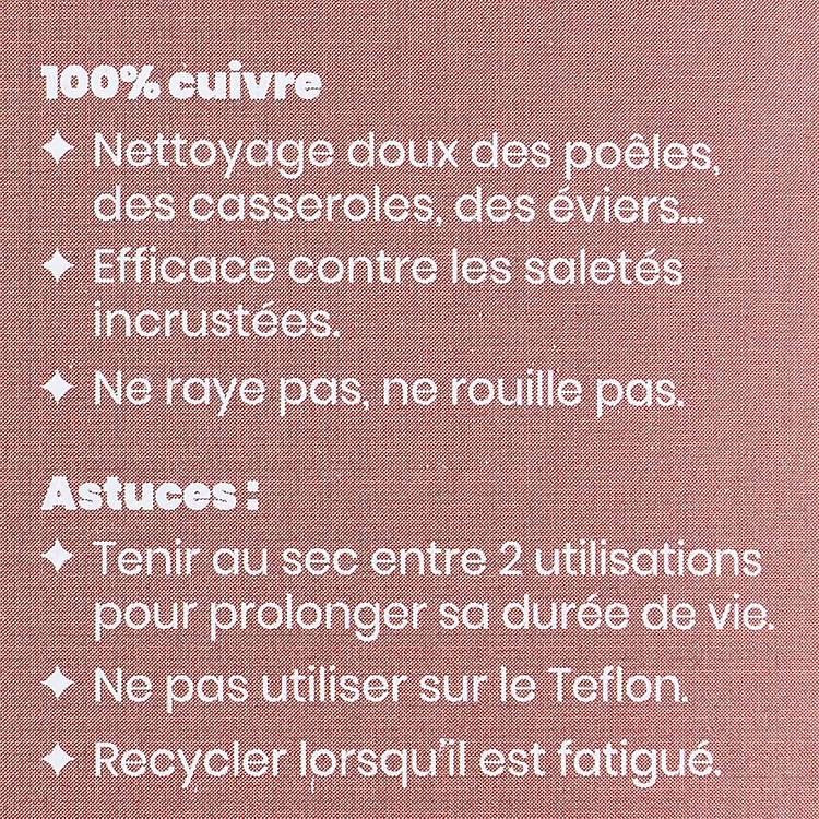 Anti-bactérien par nature, le cuivre fait aussi le ménage côté hygiène. Fini les éponges douteuses en plastique. Ce petit disque malin, au format généreux, tient bien en main et va à l’essentiel. Et pour une fois, efficacité rime avec esthétique. Seul bémol : à garder loin des surfaces en téflon.