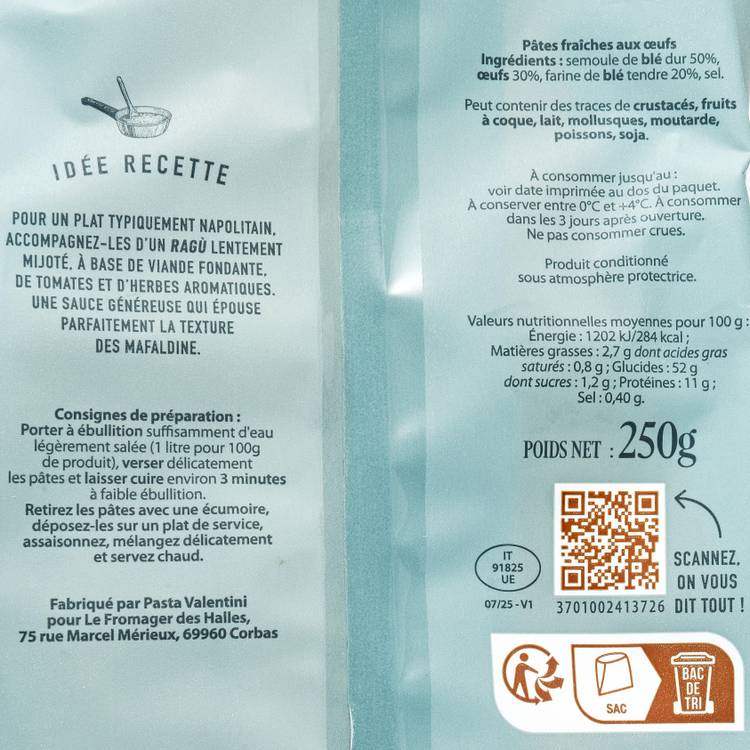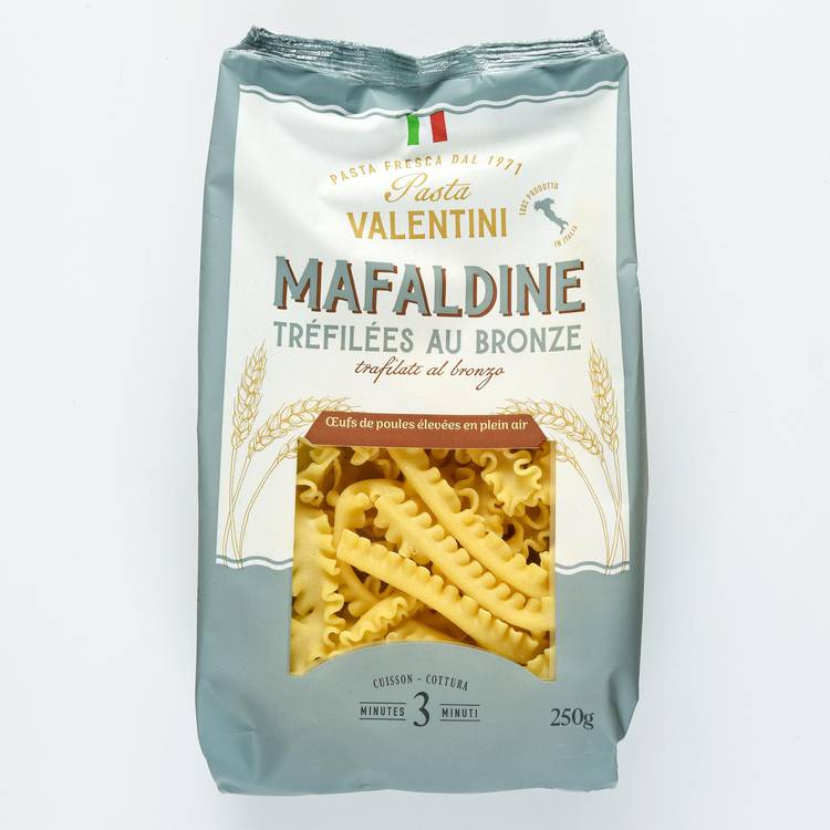 Les mafaldine, aussi appelées "reginette", sont des pâtes longues originaires de Naples. Leur forme singulière ,des rubans plats bordés de dentelle , rend hommage à la princesse Mafalda de Savoie. Une allure royale, pour une pâte qui sait capturer les sauces dans chaque repli. Chez Pasta Valentini, elles sont façonnées avec soin, à partir de blé dur italien, et lentement séchées pour préserver leur texture ferme et leur goût authentique.