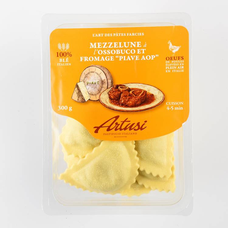 Les mezzelune Artusi, c’est l’Italie du nord qui s’invite à table, en version généreuse et cuisinée. Inspirées d’une recette traditionnelle, ces pâtes en demi-lune sont garnies d’un véritable ossobuco mijoté — jarret de veau, légumes fondants — cuisiné directement dans les ateliers de la maison Artusi. On sent la main artisanale, le soin porté à chaque ingrédient : blé issu d’une filière italienne certifiée, œufs plein air, viande locale. Le résultat est à la fois fondant, gourmand et parfaitement équilibré.