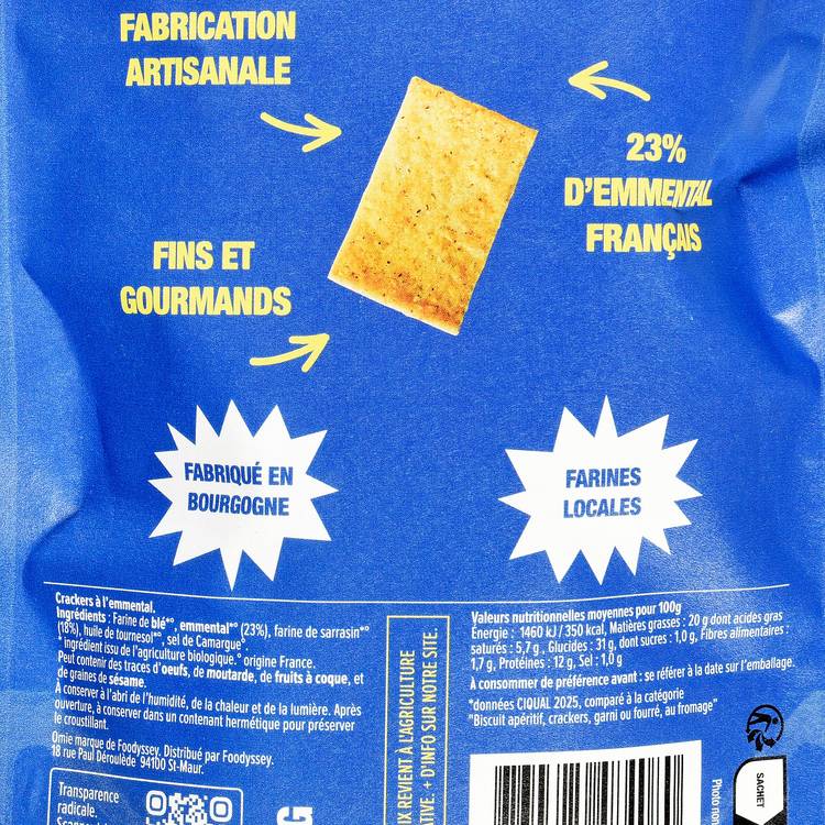Origine : Seulement 5 ingrédients, tous 100% français, dont 99% issus de Bourgogne Franche-Comté. Farines de blé et de sarrasin locales pour le croquant, huile de tournesol du territoire, et emmental râpé du Doubs, directement de fromagerie. Une recette courte, maîtrisée de bout en bout.