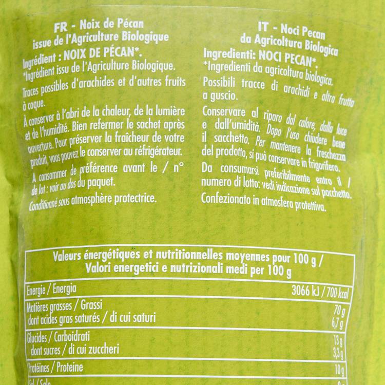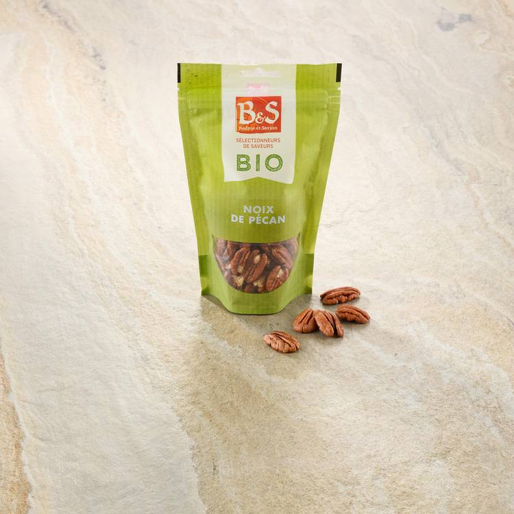 Noix de pécan bio, récoltées avec soin, triées sans ajout, puis conditionnées sous atmosphère protectrice pour préserver toute leur fraîcheur et leur croquant.