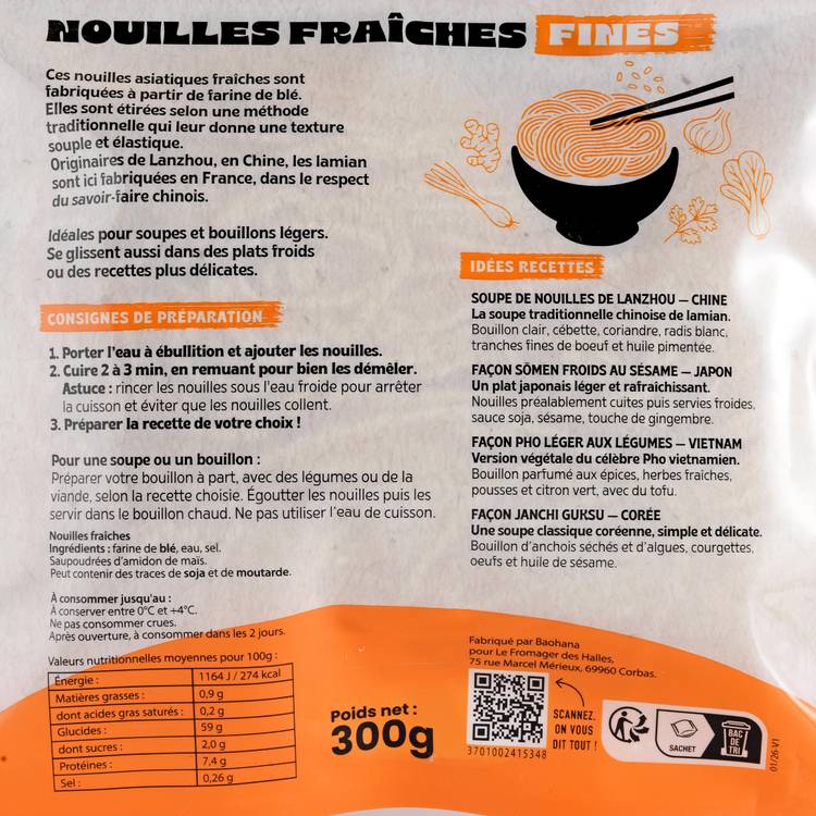 Origine : Fabriquées en France, à Ivry-sur-Seine, par Baohana. Farine de blé, méthode artisanale inspirée des Lamian de Lanzhou. Le respect du savoir-faire chinois, avec la rigueur d’un atelier parisien.
