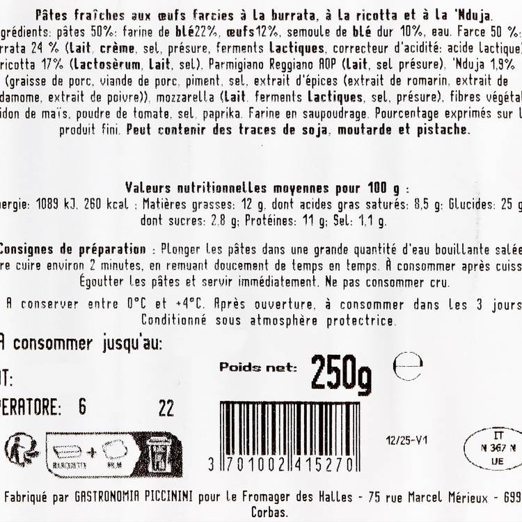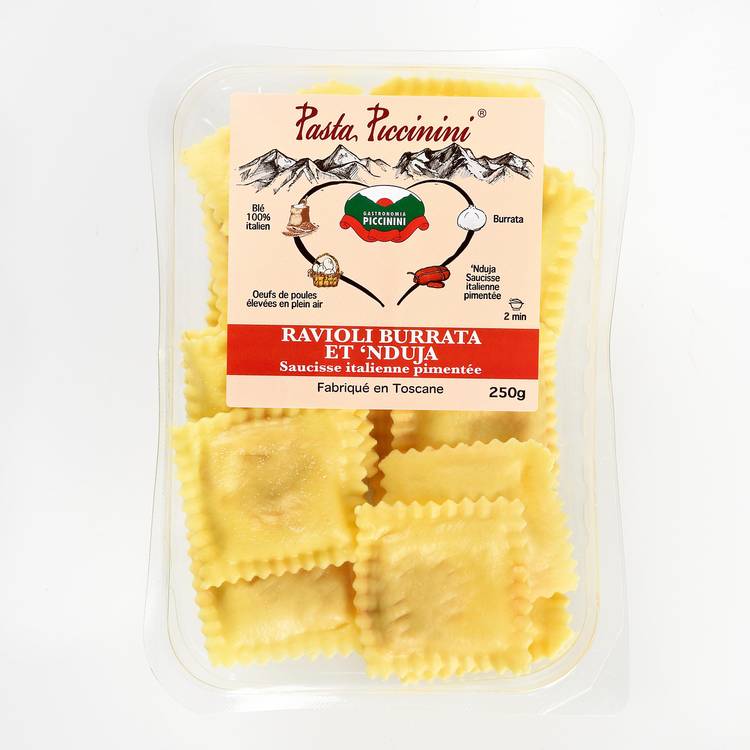 Origine : Signés Gastronomia Piccinini, en Toscane, avec un vrai savoir-faire sur les pâtes fraîches. La ’nduja, spécialité calabraise, apporte une identité plus relevée que des ravioli classiques au fromage.