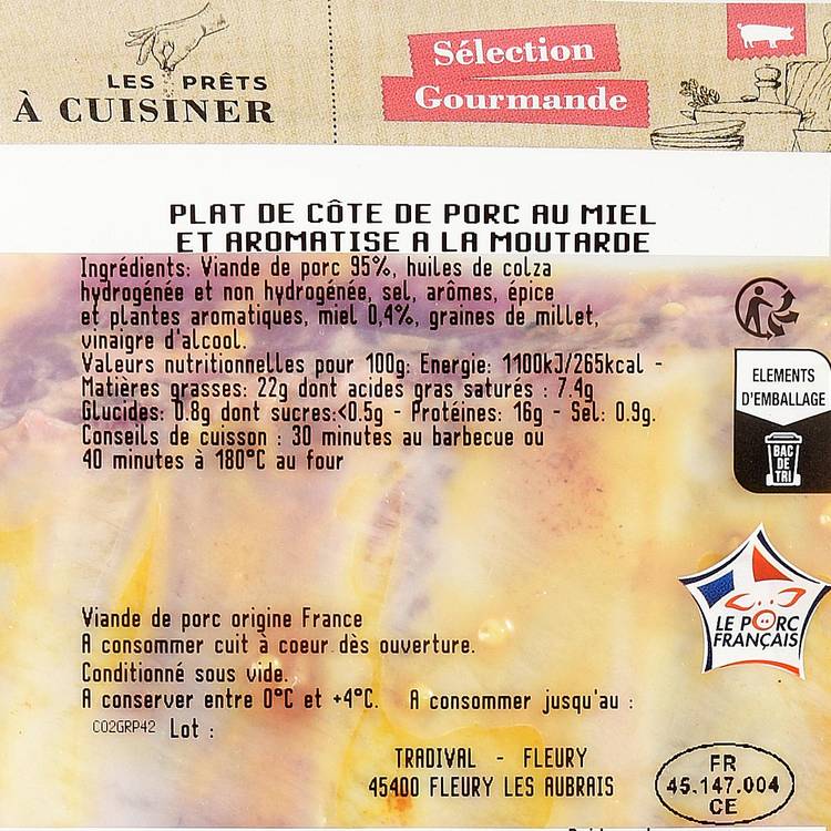 Saveur : Les ribs de porc sont charnus et fondants, avec une belle présence en bouche. Le miel apporte une touche douce et caramélisée, équilibrée par la moutarde qui relève l’ensemble avec une pointe légèrement piquant.