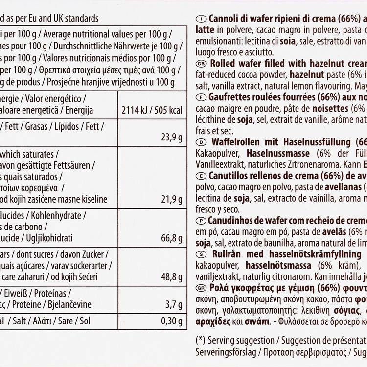 Les rouleaux de gaufrette Lago à la crème de noisette offrent une explosion de gourmandise à l’italienne. À l’extérieur : une fine gaufrette ultra‑légère, croustillante et délicate. À l’intérieur : une crème onctueuse à base de noisettes finement sélectionnées (≈ 6 % dans le fourrage) . Le contraste entre le croquant du biscuit et le fondant de la garniture crée une harmonie subtile à chaque bouchée.