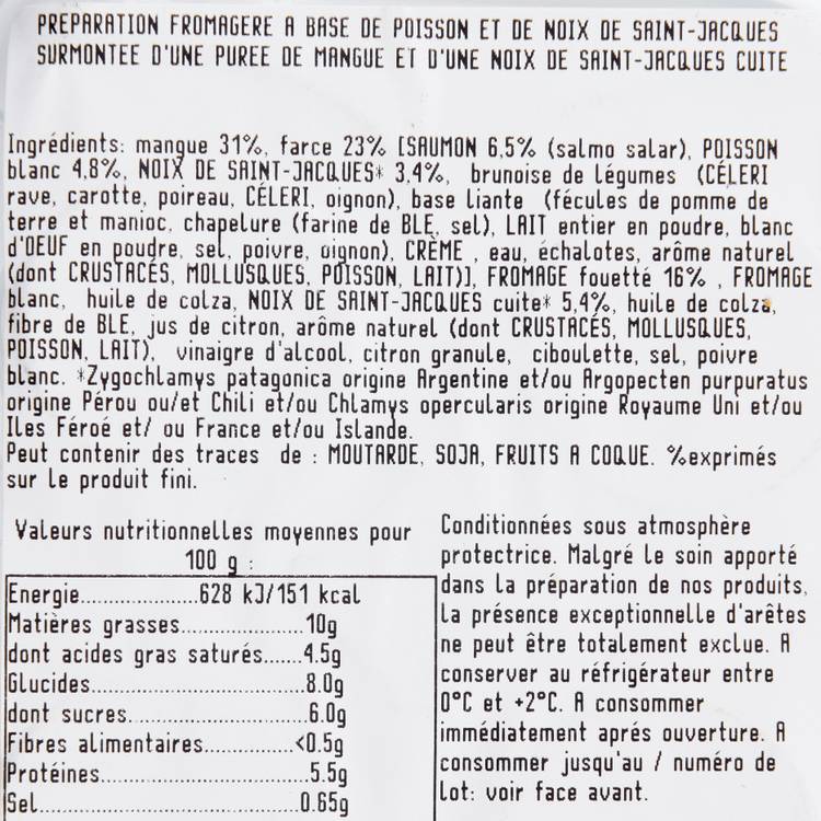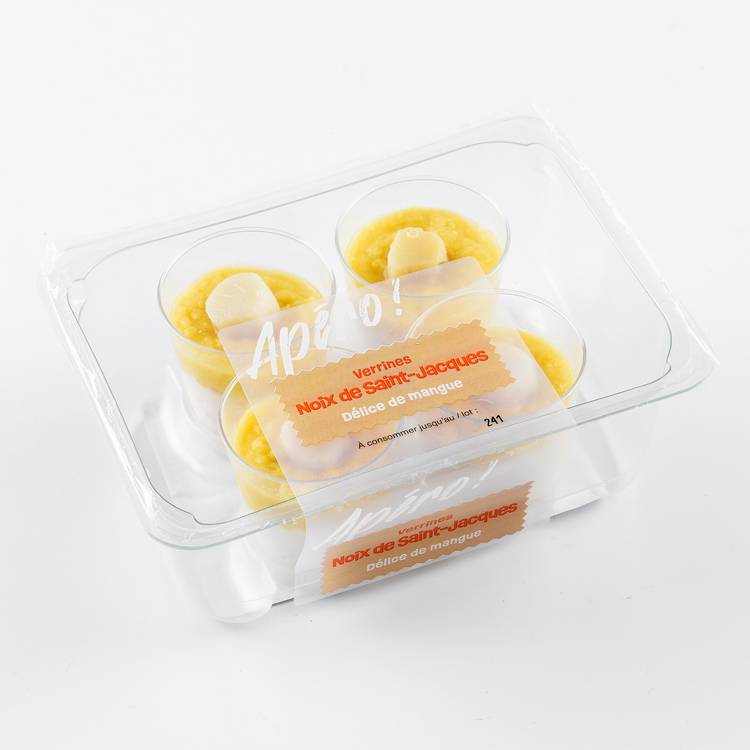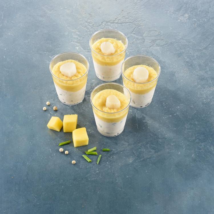 Une verrine tout en douceur où la finesse des Saint‑Jacques rencontre la douceur ensoleillée de la mangue. Les Saint‑Jacques, délicatement coupées en petits dés, se mêlent au fromage fouetté, aérien et crémeux, comme une caresse marine. La purée de mangue, douce et parfumée, vient chuchoter une note sucrée et exotique. Le contraste des textures est subtil : le moelleux délicat des fruits de mer, l’onctuosité légère du fromage, la fluidité sucrée de la mangue. C’est une préparation raffinée, presque feutrée. Elle évoque une escapade gustative sur une terrasse au bord de la Seine, un accord entre mer et soleil, tout en finesse. La verrine est humble, mais elle sait se faire mémorable.