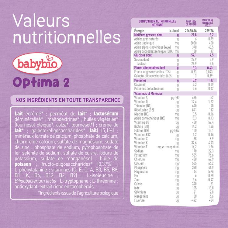 Lait en poudre bio pour nourrissons élaboré en France avec du lait de vache français, conforme à la réglementation pour les nourrissons dès la naissance. Le lait écrémé provient de vaches élevées en France dans le respect du bien-être animal selon les normes biologiques. Important : Le lait maternel est l'aliment optimal pour les nourrissons, mais si vous ne pouvez pas allaiter, consultez votre médecin pour choisir un lait pour nourrissons adapté dès la naissance. Ne changez pas de lait sans avis médical.