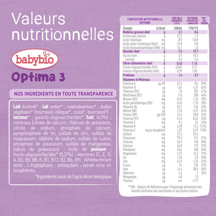 Lait en poudre bio pour nourrissons élaboré en France avec du lait de vache français, conforme à la réglementation pour les nourrissons dès la naissance. Le lait écrémé provient de vaches élevées en France dans le respect du bien-être animal selon les normes biologiques. Important : Le lait maternel est l'aliment optimal pour les nourrissons, mais si vous ne pouvez pas allaiter, consultez votre médecin pour choisir un lait pour nourrissons adapté dès la naissance. Ne changez pas de lait sans avis médical.