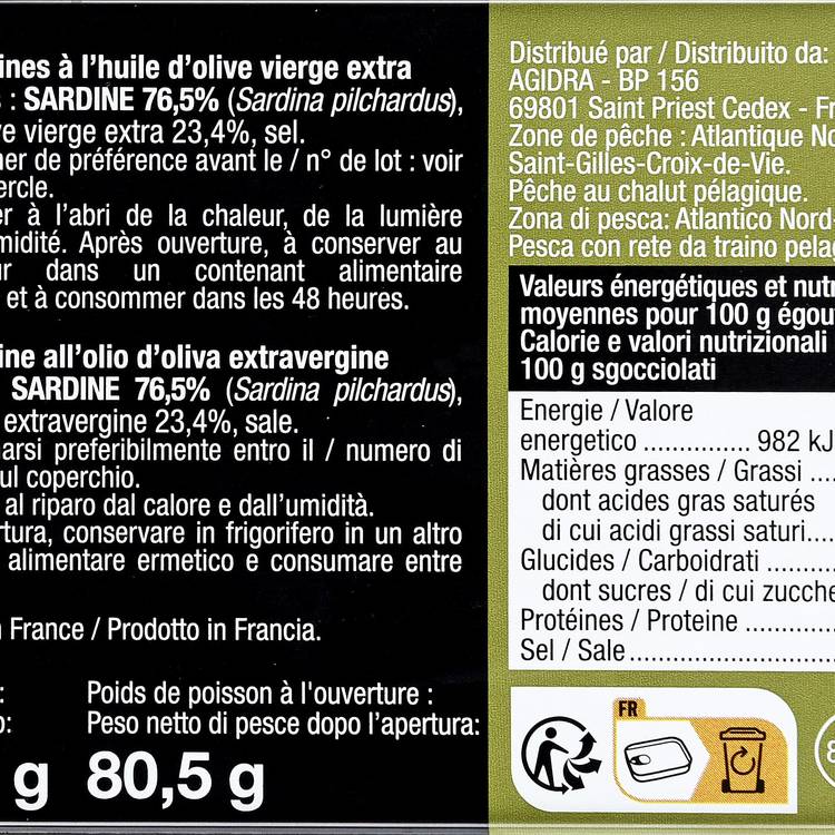 Origine : Sardines issues d’une fabrication française, préparées avec soin puis mises en boîte dans une huile d’olive vierge extra qui respecte le poisson et enrichit sa saveur.