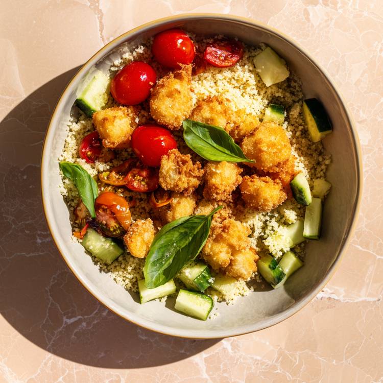 Assemblez le bowl : Répartissez le couscous de manioc dans les bols, ajoutez les légumes frais et les accras de morue bien chauds puis arrosez généreusement de sauce vierge avant de servir.