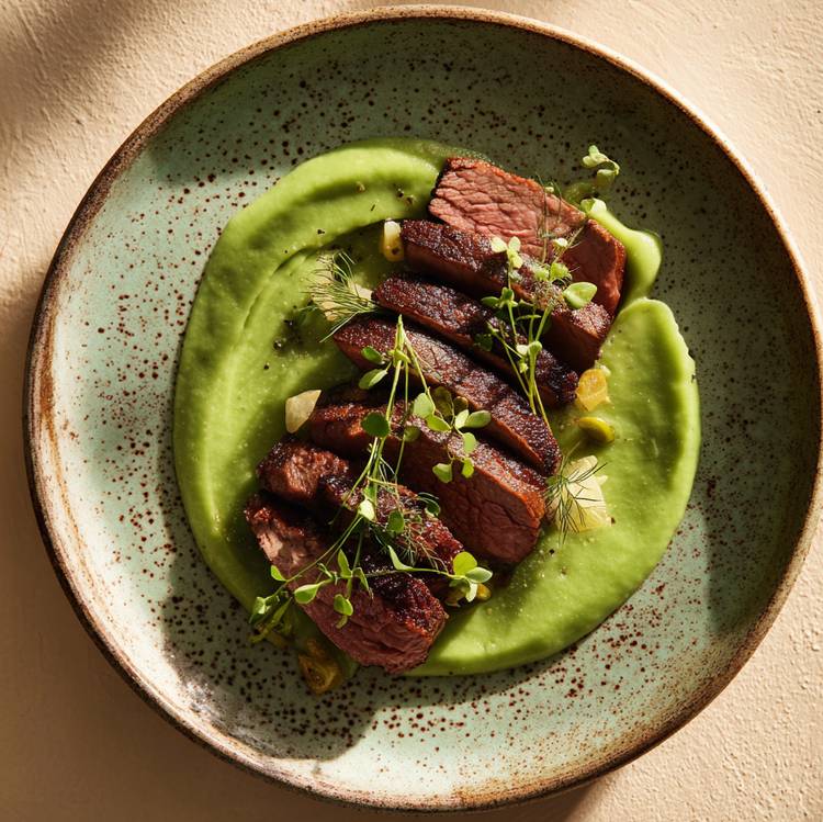 Dressez et servez : Coupez la bavette en tranches, servez-la sur un lit de purée de haricots verts, et terminez par un filet d’huile d’olive citronnée. Simple, green, efficace.
