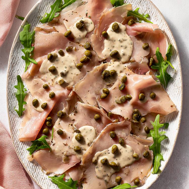 Et si on revisitait le vitello tonnato sans veau, mais avec une chiffonnade fumée pleine de caractère ? Ici, la viande cède sa place au jambon de Prague, délicatement posé sous une onctueuse sauce au thon maison. Résultat : un plat frais, rapide à préparer, qui joue sur les contrastes et réconcilie tout le monde à l’apéritif comme en entrée.