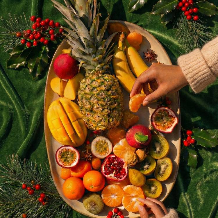 Entre deux tranches de pain d’épices, glissez un peu d’exotisme avec la Corbeille Étoile des Tropiques. Ananas Victoria ultra juteux, mangue à point, fruits de la passion acidulés, le tout escorté de mangoustans, kiwis jaunes, kakis fondants et clémentines corses. Des textures charnues, des parfums suaves et une explosion de couleurs pour illuminer les tables de fin d’année. À partager telle une pause vitaminée entre deux festins ou en guise de dessert léger.