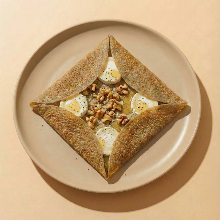 Une crêpe doucement réchauffée : Faites fondre le beurre dans une poêle chaude, réchauffez une galette à feu doux, ajoutez quatre rondelles de fromage et laissez chauffer 2 min jusqu’à ce qu’il soit tiède et légèrement fondu, puis pliez la crêpe.