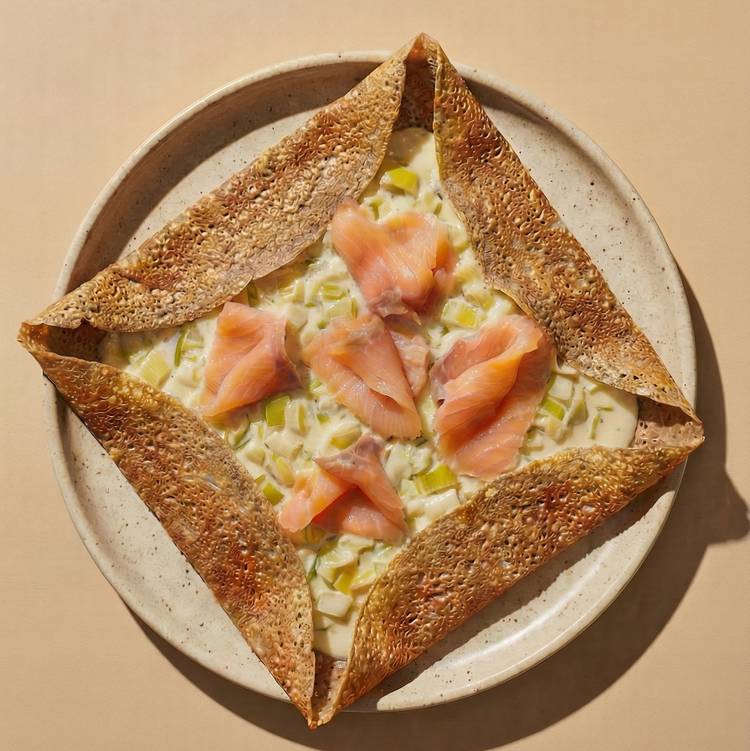 La galette bretonne accueille une fondue de poireaux doucement crémée et un saumon fumé de caractère. Peu d’ingrédients, beaucoup de goût. La bonne idée des dîners rapides qui font sérieux, même un mardi soir.