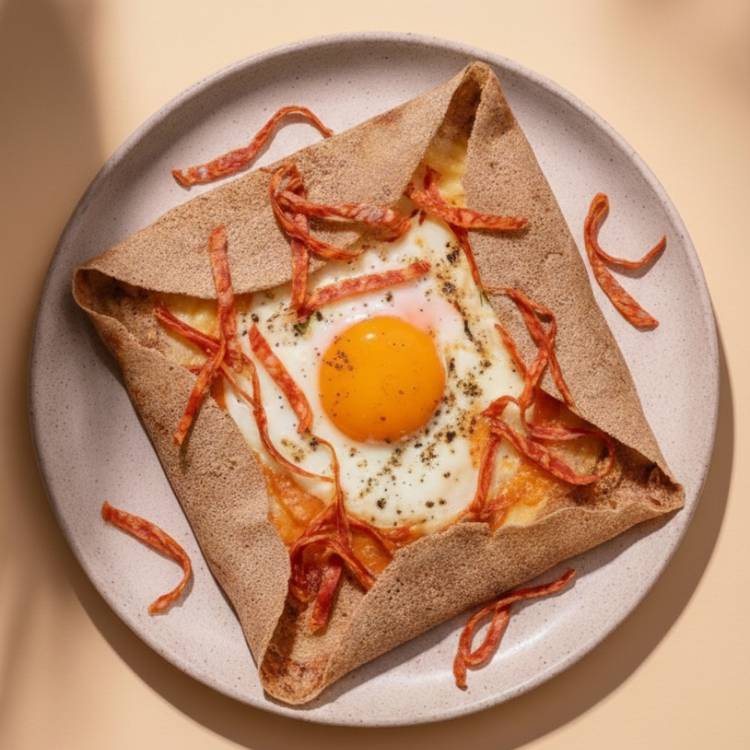 Une galette de blé noir bien chaude, de l’emmental qui fond sans brûler, du chorizo finement tranché et un œuf coulant.