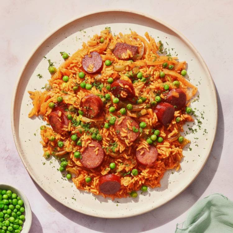 Riz fondant, chorizo bien choisi, oignon doux, petits pois verts et paprika fumé : l’équilibre est net.