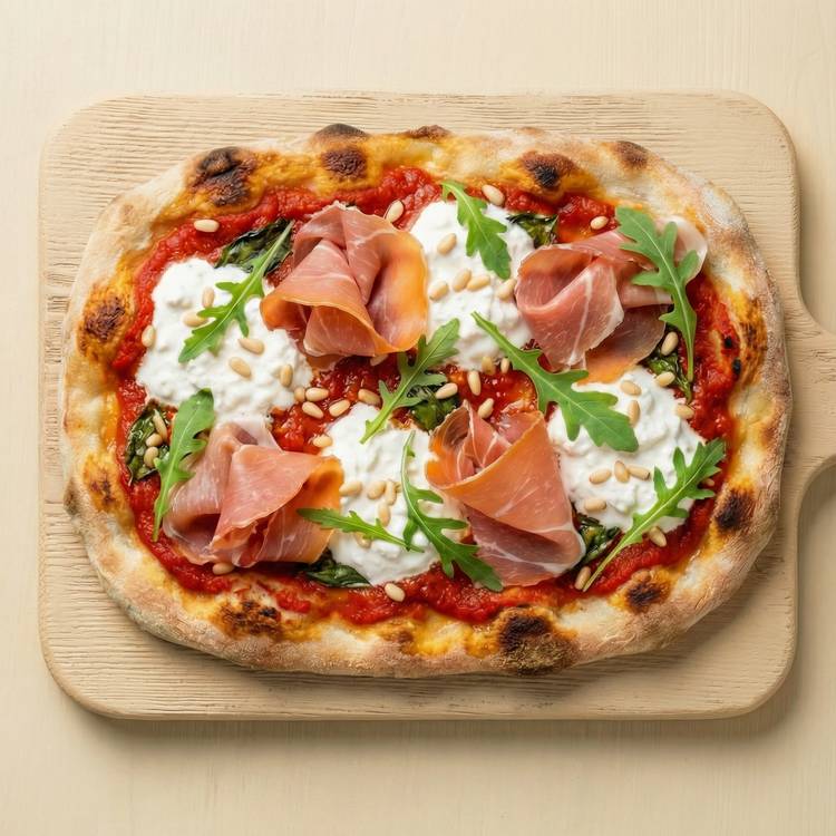À la sortie du four, ajoutez le jambon cru, la straciatella, de la roquette quelques pignons de pin et nappez le tout d’un filet d’huile d’olive.