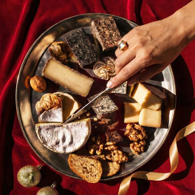 Une planche de fromages, oui, mais version haute couture. Du brie à la truffe qui fleure bon la forêt, un Sainte-Maure de Touraine à la cendre noble, une fleur de tête de moine qui se déroule comme un ruban, une tomme de brebis à l’ail noir pleine de caractère, et un comté affiné juste ce qu’il faut pour faire frémir les papilles. Le tout réveillé par quelques fruits, un pain croustillant, une touche de miel… et vous voilà avec une planche aussi élégante qu’un dîner sur les toits de Paris.