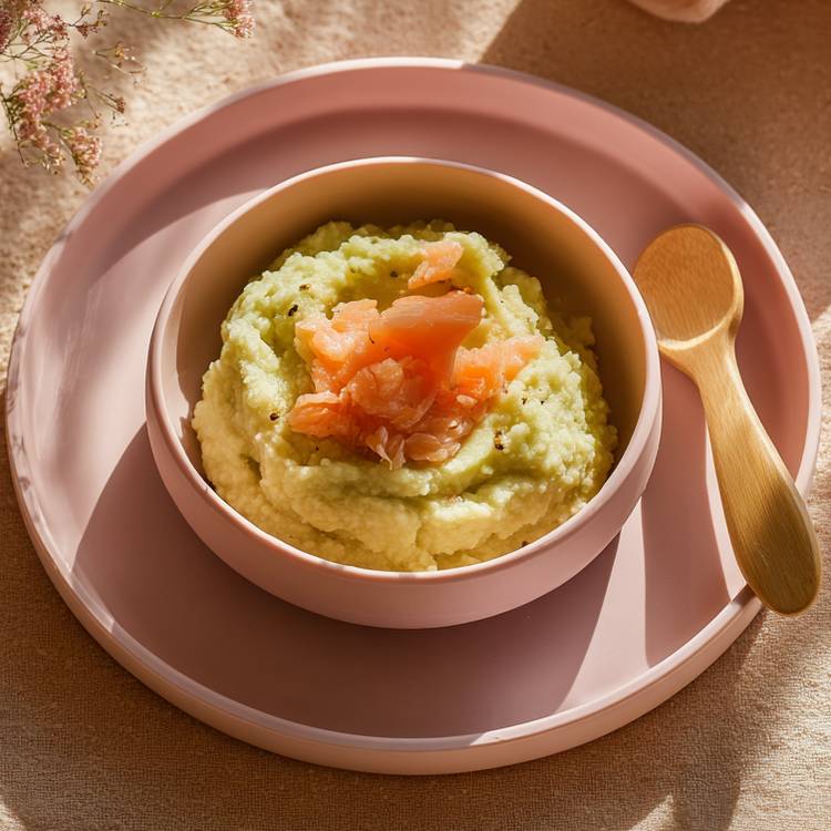 Mixez ensemble le choux-fleur, les brocolis, les pommes de terre, le saumon et l’eau de cuisson pour obtenir une texture lisse mais onctueuse.