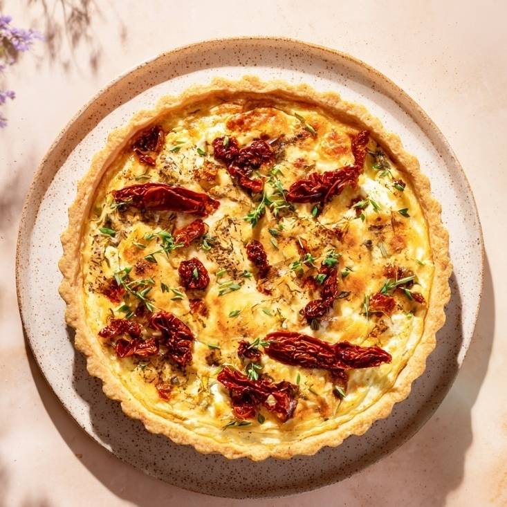 Cette quiche au chèvre et aux tomates séchées est une invitation à savourer des saveurs méditerranéennes en toute simplicité. La douceur du fromage de chèvre fondant se marie parfaitement avec le goût intense des tomates séchées, le tout sur une pâte brisée croustillante. Accompagnée d'une salade batavia fraîche et croquante, assaisonnée d'une vinaigrette légère, elle constitue un repas équilibré et gourmand. Parfaite pour un déjeuner sur le pouce ou un dîner léger, cette quiche peut également être servie en entrée lors d'un repas entre amis. Pour varier les plaisirs, n'hésitez pas à ajouter quelques olives noires ou des herbes fraîches comme du basilic ou du thym. La quiche se conserve aisément au réfrigérateur pendant deux jours et peut être dégustée froide ou légèrement réchauffée au four.