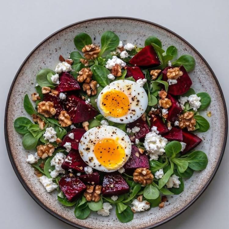 Simple et raffinée, cette salade mise sur l’équilibre parfait entre douceur et caractère. La betterave, fondante et légèrement sucrée, se marie à merveille avec la mâche croquante et le chèvre frais. Les noix apportent un côté gourmand et l’œuf mollet, avec son jaune coulant, vient lier le tout. Idéale pour un déjeuner léger ou une entrée qui en impose, cette recette met en avant des ingrédients bruts et savoureux. Pour une touche encore plus relevée, ajoutez quelques graines de courge ou une pincée de piment d’Espelette.