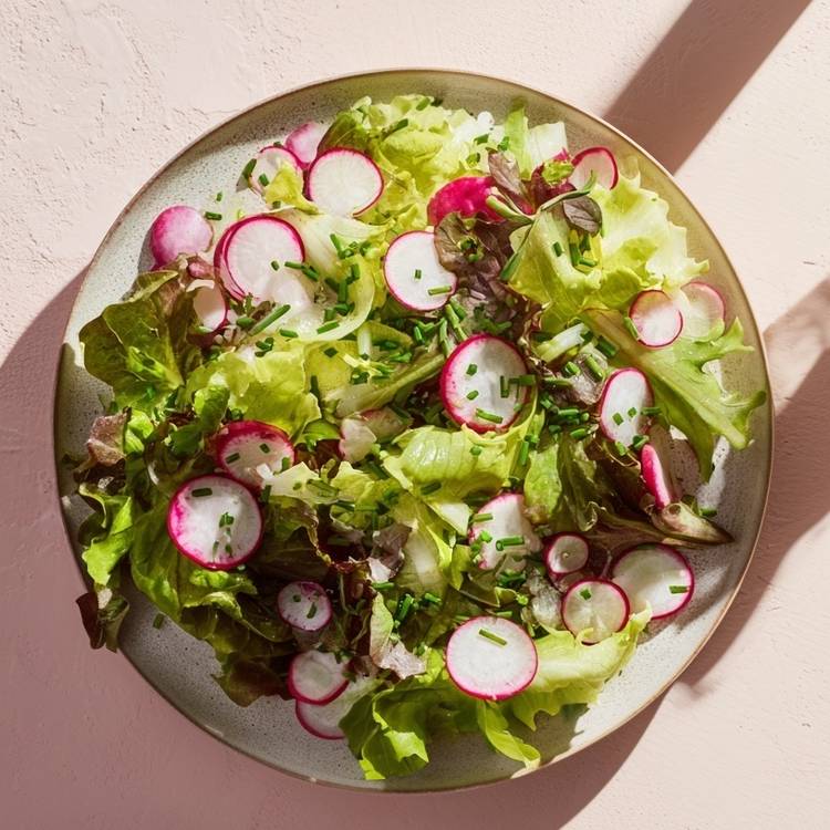 Mélange de jeunes pousses, radis finement tranchés et vinaigrette citronnée : un side frais et coloré, parfait pour accompagner un repas de Pâques ou équilibrer un plat plus gourmand.