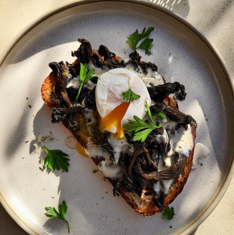 Avec ses champignons noirs, sa sauce crémeuse gris clair et son œuf mollet coulant, La Tartine de la mort n’a pas volé son nom. Tout est dans l’équilibre : un pain croustillant, des trompettes ultra-savoureuses, une réduction maison qui booste la crème, et un jaune d’œuf qui lie le tout. L’assiette est généreuse, réconfortante, et surtout délicieuse.