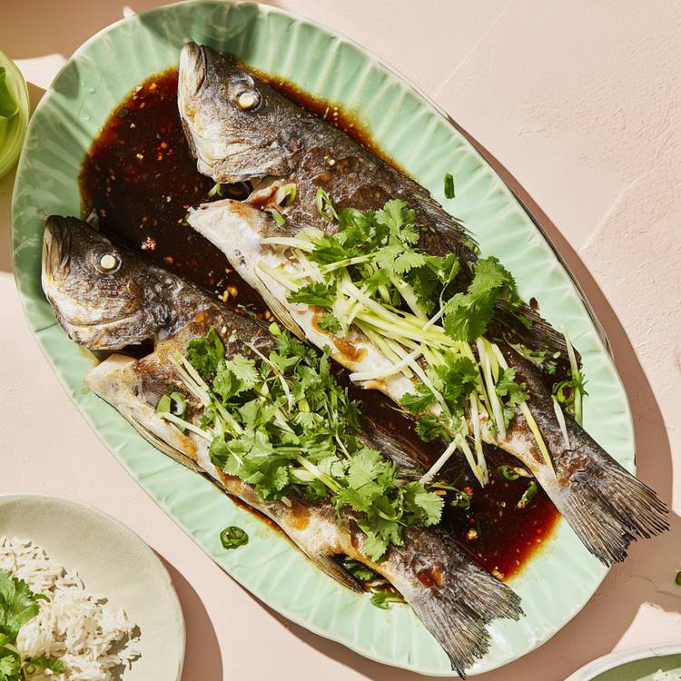 Au Nouvel An chinois, le bar entier symbolise l’abondance. Ici, pas besoin de matériel spécifique : le four recrée une vapeur douce et enveloppante.