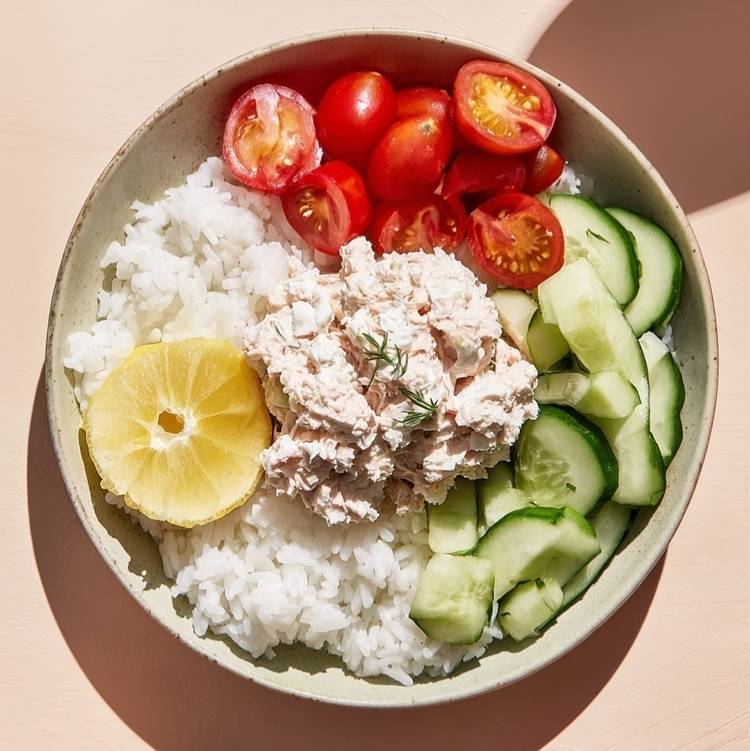 Quand le frigo est presque vide mais que l’envie de bien manger reste intacte, ce bol fait le job. Une rillette de thon au fromage frais, du riz tiède et des légumes croquants.