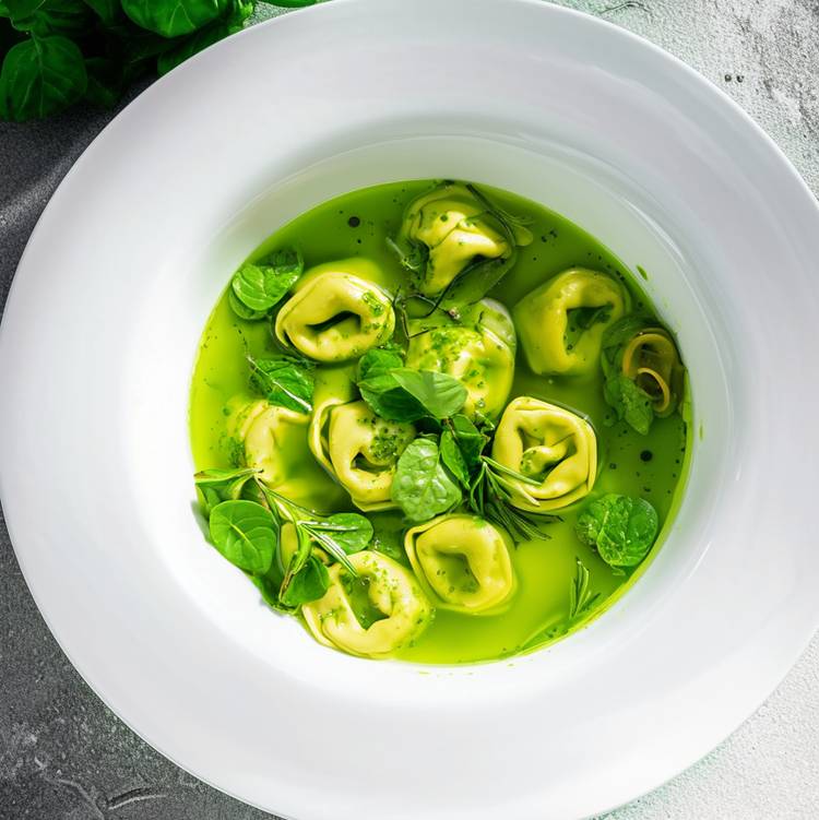 Servez les tortellonis bien chauds dans leur bouillon, ajoutez le basilic, un filet d’huile d’olive et un peu de poivre. C’est prêt, déjà.