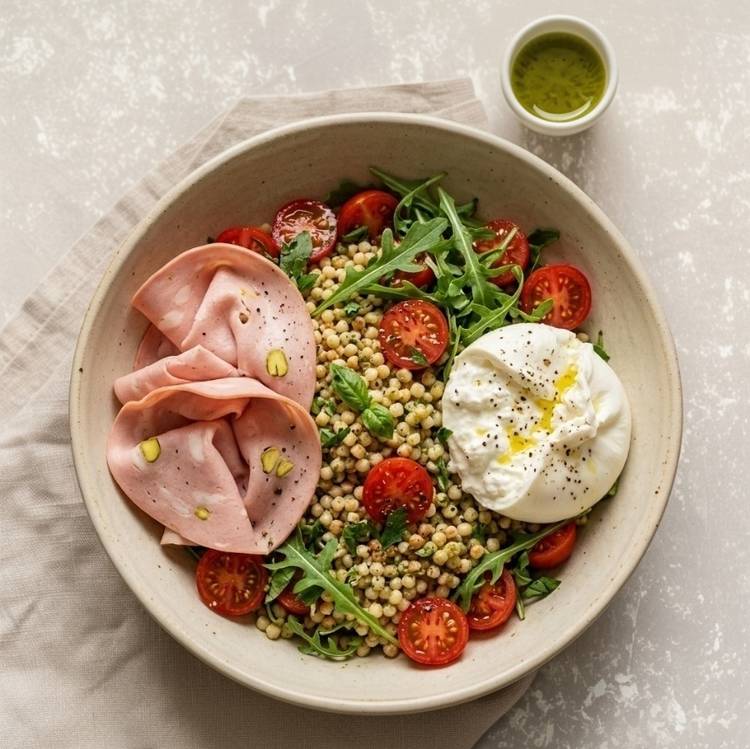 Entre deux réunions et un métro bondé, ce bowl italien remet les pendules à l’heure côté goût. La fregula, petite pâte sarde au grain toasté, remplace le blé avec panache.