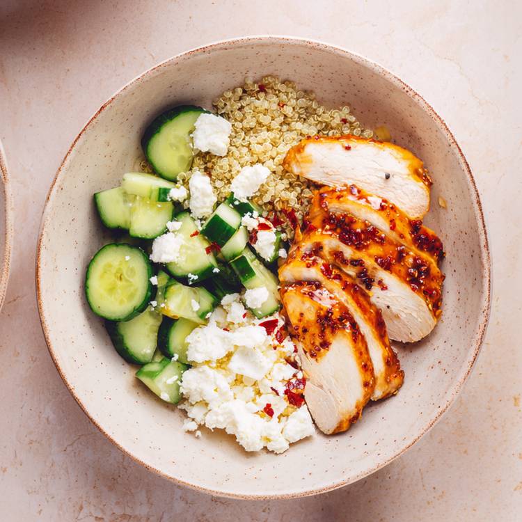 Assemblez le bowl : Répartissez le quinoa, ajoutez le poulet tranché, le Fromage cottage et le Concombre coupé en dés. Servez immédiatement.