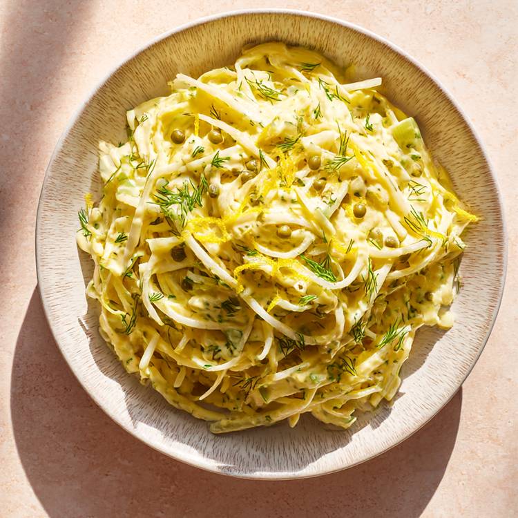 Épluchez soigneusement le céleri-rave à l’aide de l’épluche-légumes, puis râpez-le finement à la main ou au robot. Arrosez immédiatement de jus de citron pour éviter qu’il noircisse.