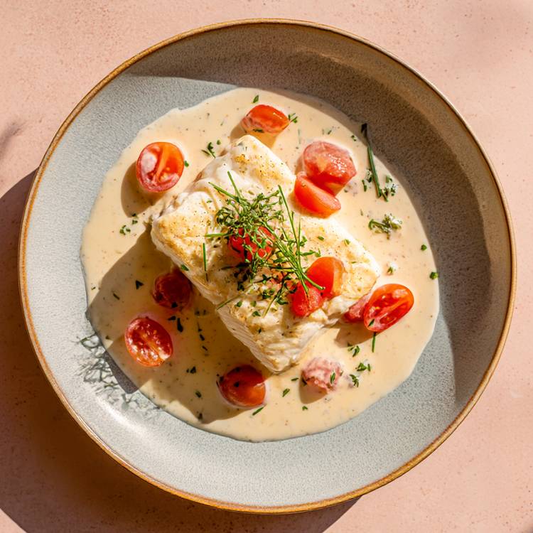 Le lieu noir s’enrobe d’une crème moutardée délicate, relevée juste ce qu’il faut.